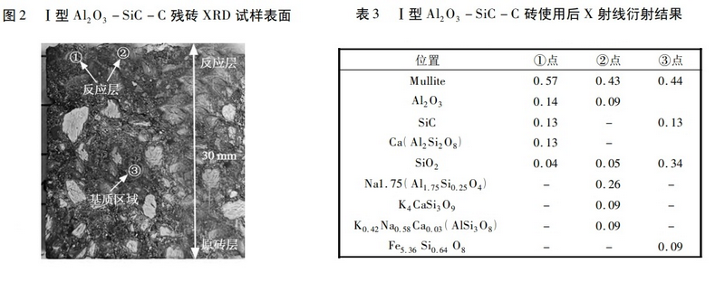 可見,Ⅰ型Al2O3-SiC-C磚在鐵水包包嘴和圍罐兩處鐵水沖刷較嚴重的部位受損嚴重,同時殘磚耐壓強度損失較大,表明Ⅰ型 Al2O3-SiC-C磚高溫狀態下抗鐵水沖刷性能不佳。對拆除的Ⅰ型Al2O3-SiC-C磚進行物相檢測,試樣表面及檢測位置見圖 2。衍射結果見表3。