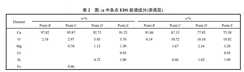 1為鎂鉻磚(滲透層)各元素的面分布與 Cu2O 的能譜特征峰。由圖1可見,Cu–CuxO 等金屬熔體滲透形貌清晰可辨,電熔鎂鉻砂、鎂砂與基質鉻鐵礦尖晶石結合界面的滲透(亮白色區域)主要由 CuO 元素組成。表2為圖 1a 中各點 EDS 能譜成分(滲透層)。由表2可知方鎂石晶粒與基質鉻鐵尖晶石結合界面以金屬熔體氧化亞銅 (Cu2O)滲透為主。