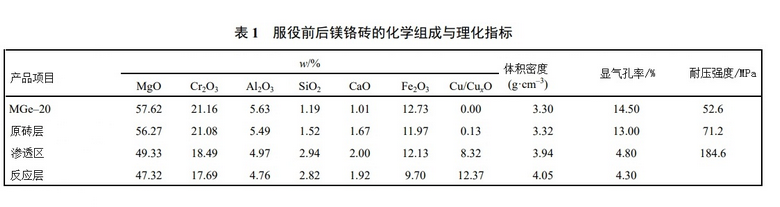 NGL爐現場用后鎂鉻磚的觀察,Cu–CuxO 等熔體對耐火材料的侵蝕以滲透為主,這種熔體深入滲透到鎂鉻磚結構,可達260 mm 以上。耐火材料的體積密度和氣孔率隨著熔體的滲透而發生變化,表 1(理化指標)顯示殘磚滲透層的氣孔率較類原磚層有大幅下降,體積密度相應的增加,反映了材料內部結構和性質的顯著變化。