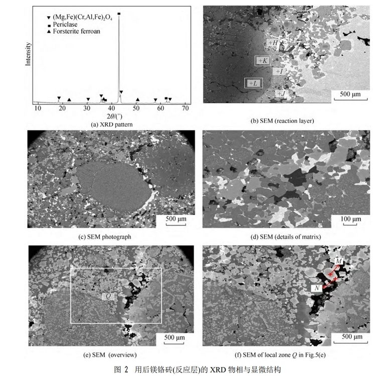 NGL 火法精煉工序的廢雜銅一般雜質含量在 4%20%,廢雜銅雜質含量明顯高于銅精礦熔融粗銅的雜質量(0.5%2.0%),廢雜銅中含有 PbZnAsSbBiNiFe 等金屬元素,NGL 爐精煉廢雜銅所含雜質過多需反復氧化和造渣,致使爐襯耐火材料易被侵蝕。圖2為用后鎂鉻磚(反應層)XRD物相與顯微結構。由圖2可知,鎂鉻磚熱面(反應層) NGL爐渣與金屬銅熔體的雙重作用,熔渣與MgO顆粒反應生成鎂橄欖石(含鐵)(Mg,Fe,Ni)O 固溶體,與鉻鐵尖晶石形成(Mg,Fe, Ni)(Cr,Al,Fe)2O4 的復相尖晶石。殘磚反應層XRD物相為方鎂石和鉻鐵礦尖晶石,少量橄欖石(含鐵)物相。鎂砂顆粒易受熔渣的侵蝕,部分方鎂石晶粒被溶渣侵蝕,在基質或顆粒與基質結合處溶解成孔及裂痕。鉻鐵礦顆粒沒有被深入侵蝕現象,在 1 700 條件下,FeO Cr2O3 MgO 的固溶度為 14%,反映了鎂鉻質耐火材料具有良好的抗渣滲透能力。